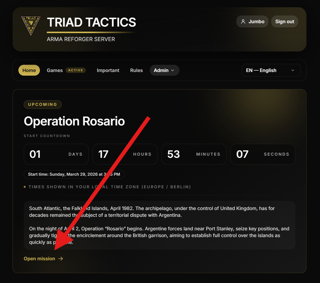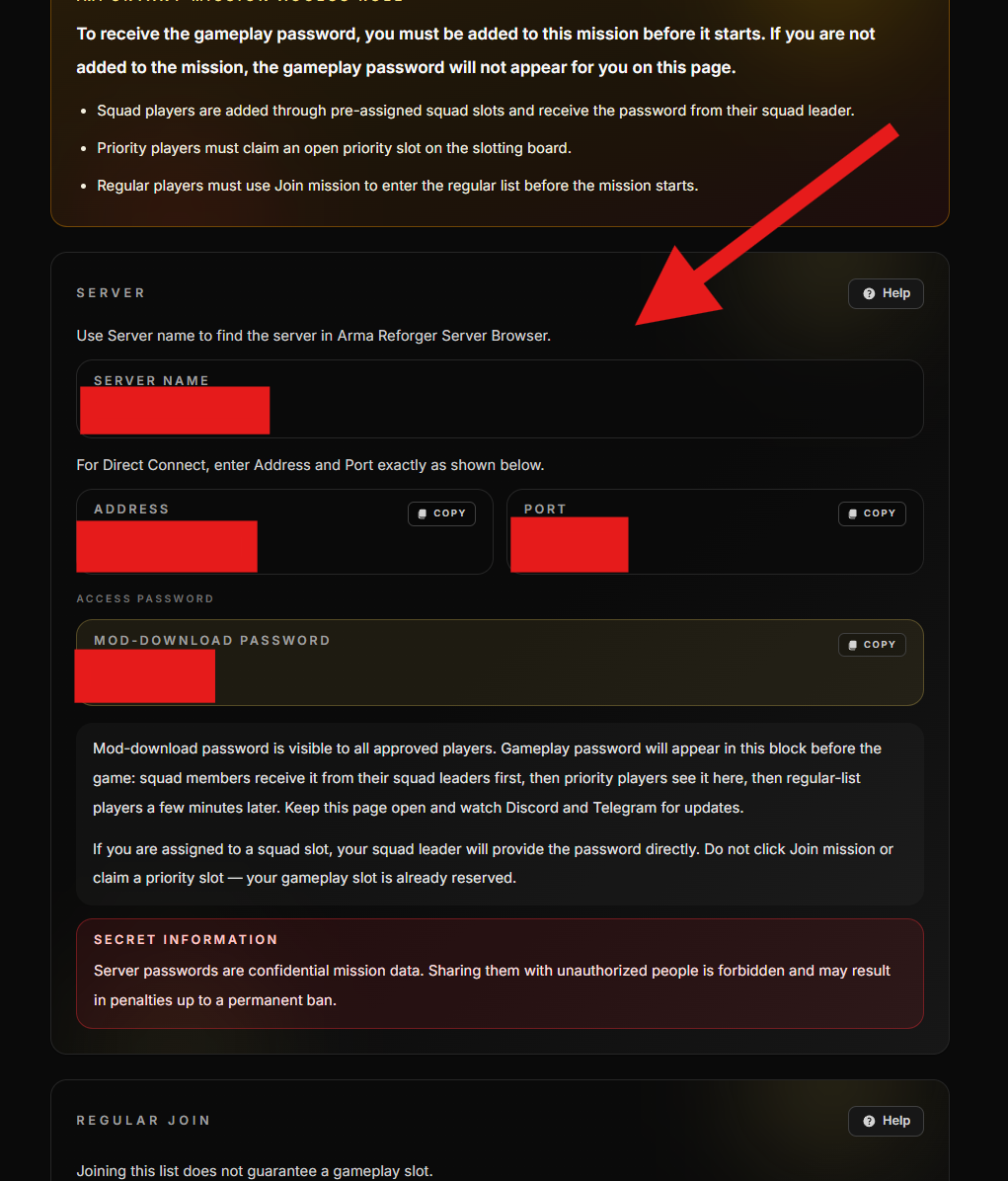 - Regular players — everyone else. Regular players join the mission through the Join mission button. Being on the list does not guarantee a slot, but when admins release regular access, everyone on the list receives the gameplay password