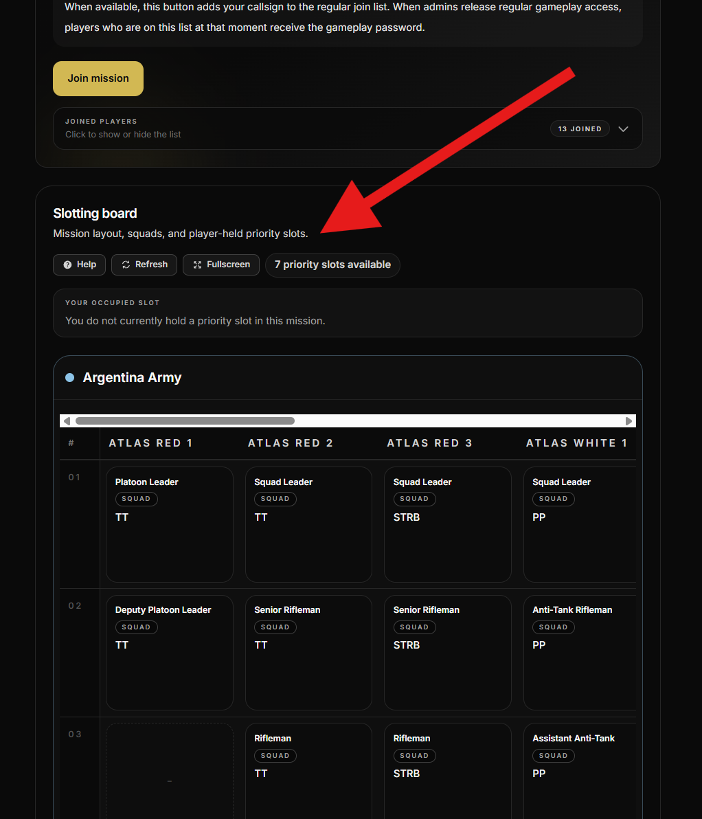 After a mission is published, the admin sets up the slotting board — a table showing all squads, roles, and available positions. Squad slots are pre-assigned. Priority players can then claim any open priority slot. Regular players join the regular list using the Join mission button