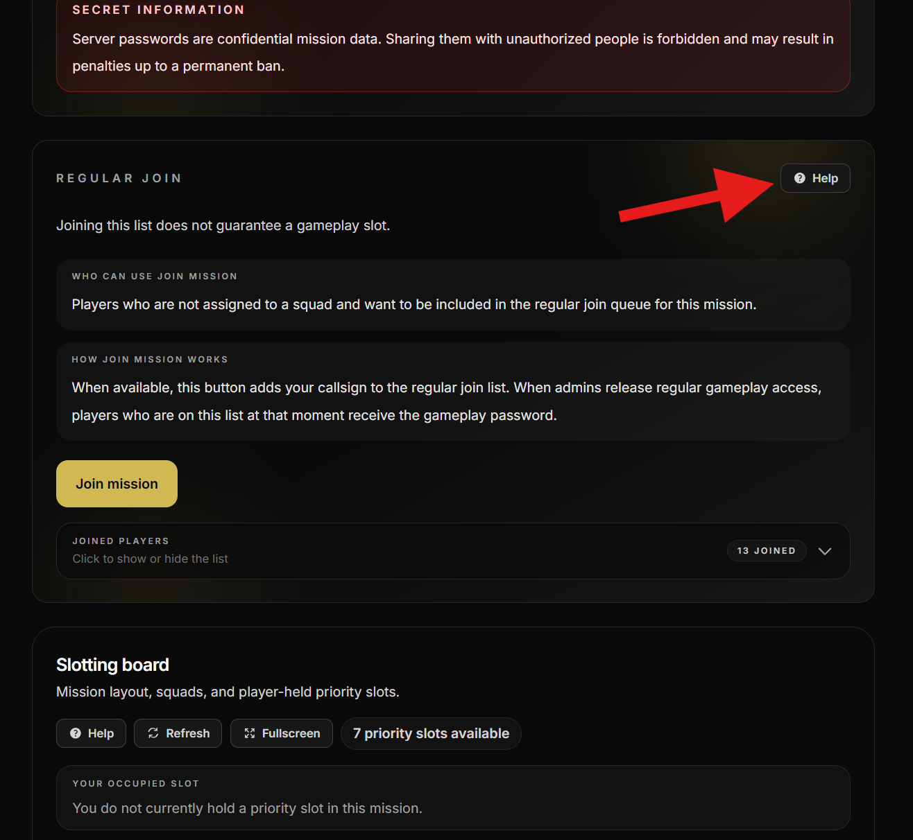 Each mission page has a Help button that opens a detailed guide about how the mission page works, player categories, the slotting board, and password distribution
